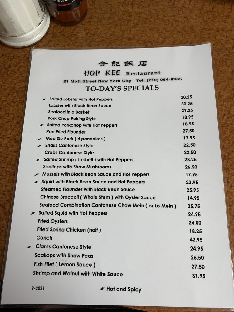 Hop Kee is a classic NYC Chinatown gem offering Cantonese cuisine with a focus on seafood. Located at 21 Mott St, this basement restaurant provides a casual dining experience with fast and efficient service. The menu boasts a variety of dishes, with standout options like the Hop Kee Chicken, Barbecue Steak with Chinese broccoli, and String Beans in Black Bean Sauce. Customers praise the generous portion sizes meant for family-style dining and the delicious flavors of each dish. While the ambience may not be fancy, the longstanding staff and traditional atmosphere add to the authentic experience. Remember to bring cash as they do not accept cards. Hop Kee is the perfect spot for group gatherings and satisfying late-night cravings for flavorful Chinese food in the heart of Chinatown.